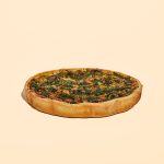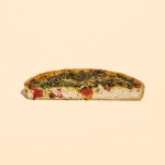 Курка, томати з пармезаном, соусом песто, часником і вершками, на пісочній основі.